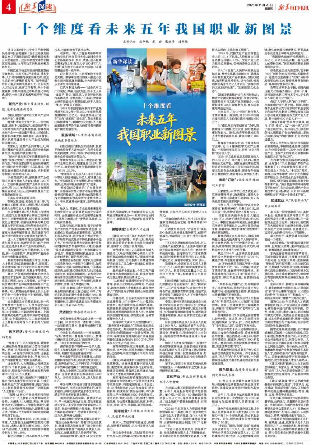 来源:《新华每日电讯》11月28日 作者:新华每日电讯记者 熊正彦 龙攀 张小杰 刘凯雄 视觉设计:贾希泉 近日公布的《中共中央关于制定国民经济和社会发展十五五规划的建议》((简称《建议》)描绘了我国未来五年的发展蓝图。未来五年,产业升级、人口结构调整等诸多浪潮将被改写。《新华深读》栏目记者采访了相关部委、企业领袖、行业专家、教育界人士等,从十大维度观察,勾勒出中国劳动力市场的变化与机遇,并提供了三点思考。未来趋势的理想“导航地图”。新兴产业:推动研发、制造、运营全链条新阵地。 《建议》提出“培育壮大新兴产业和未来产业”并部署:着力打造新兴支柱产业——加快发展新能源、新材料、航空航天、低层经济等四大战略性新兴产业集群;积极布局未来产业——推动数量技术、生物制造、氢能与核聚变能源、脑机接口、实体智能、第六代移动通信等六大重点产业成为新的经济增长点。专家认为,这些产业的培育和壮大,将创造跨越产业研发、制造、运营全链条的新就业岗位,形成新的就业蓄水池。 “新兴产业的重要趋势未来五年的重点是加快‘规模发展’,即从1到10的跨越。”中国国家创新发展战略研究会中国经济委员会副主任马江波表示,“规模意味着巨大的就业机会,求职者要在细分市场寻找切入点。”以低层经济的普谷哈为例,预计仅无人机运营商这个行业就有100万人的人才储备。产业研究中心主任王浩工信部赛迪研究院院长表示,到2030年,我国低端市场规模预计将突破万亿元,将创造覆盖全产业链的新就业岗位。王浩从全链条回顾:在研发制造方面,对通用设计师、飞行算法工程师、人工智能等专业人才需求旺盛。适航工程师、无人机人员和维护人员;在运营服务端,无人机集团和低空飞行器研发平台iEngineers的飞行规划师在管理职责上负责空中交通,低层数据分析师优化运营效率,低层工程师专注于开发物流、巡检等商业应用。基础设施方面,电气工程师负责地面充电设施等配套建设,低空通航飞行设计师规划安全高效的飞行路径。这一人才矩阵体现了低层经济“制造与服务一体化、软硬件协同”的产业特征,这也是许多新兴产业的共同特征。从多地发布的需求来看,人工智能、新一代信息技术的不同定位信息技术、新能源等行业需求保持旺盛。最新发布的《粤港澳大湾区(内地)人才需求目录》涵盖了信息技术、新能源、先进材料等领域,涵盖材料等20个行业约200个职位的需求、学历要求、月薪平价等信息。其中,行业需求量最高的职位包括通信技术工程师、医疗器械开发人员、光伏工程师系统、Java工程师等。由于新一代科技产业和超高清视频显示产业的快速发展,技术工程师通信、架构师尤其困难,收入较高的是新一代电子信息行业架构师,硕士以上学历,月薪1.5万至4万元。北京需求近期发布了这样的18个领域。5G-A技术研发与应用在新一代信息技术和集成智能技术研发方面是人工智能产业中人才紧缺程度最高的。上海在集成电路行业新增半导体芯片制造商等12个紧缺岗位,在人工智能领域,人工智能培训师等5个岗位被列入紧缺目录。数字经济:替代与替代诞生交响乐的变奏随着“黑灯工厂”的出现,无驾驶,数据录入、搬运、码垛等重复性的体力劳动被取代。然而,这样的场景并不是数字经济的真实写照。人工智能在消灭传统岗位的同时,也创造了大量新的高附加值岗位,催生从体力劳动到智能劳动的新职业机会。在过去的五年里,一人社部发布的72个新岗位中,有20多个与人工智能相关。预计每个新增就业岗位短期内可带动30万至50万人就业。 《建议》把“深入推进数字中国建设”作为“加快高水平科技自立自强、引领新生产力发展”的重要拓展,提出“加快人工智能等数字创新技术”和“全面实施‘人工智能+’行动”。 “我国人工智能产业规模很快将突破6000亿元,人工智能将深度重构工作结构。从解决大规模人工智能模型、算法、算力等技术问题到建立人工智能与制造业、服务业的深度融合。中国人民大学重阳金融研究院副研究员丁壮表示。智联招聘招聘数据显示,2025年前三季度,人工智能行业职位空缺同比增长3%,求职人数同比增长39%。其中,AI产品经理和人工智能工程师的需求增长率分别为178%和26%。数字化浪潮下,对不同层次人才技术和技能融合的需求越来越大。在深圳,有一家智力训练师培训机构,学员来自各行各业。培训业务从北京扩展到深圳、杭州、成都,远远不能满足需求;在上海,复旦大学吸引数千名本科生选修100多门“AI课程”,AI课程覆盖所有学科es在ulevel。应对科技冲击,主动拥抱数字化转型是关键。中国数字化建设的深入发展,不仅带动了新兴领域就业的增加,也为传统行业从业者打开了转型通道。以汽车制造为例,“过去汽车工厂主要以装配、焊装、维修为主,现在工人已经从‘拿扳手’转向‘固定系统’,演变成智能网联汽车测试人员、运维人员等。”王浩表示,工人已经从操作设备转向通过数据管理,汽车维修成为“懂AI”的服务工程师。 2024年,我国智能网联汽车产业规模将突破1万亿元,预计2030年市场规模将突破5万亿元。车企竞争将从“造车”转向“造车”服务领域:改善民生需求吸纳更多劳动力。《建议》建议“惠民生与促消费、物投资、人投资紧密结合”。健